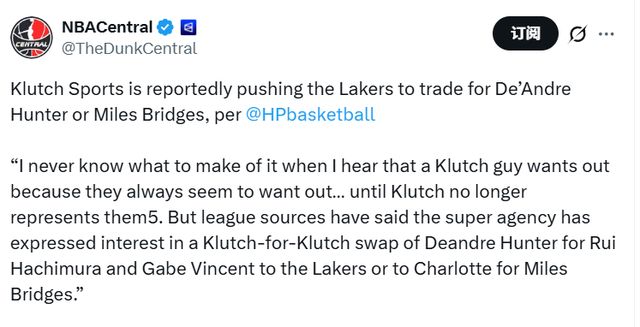 Hardwood Paroxysm寫道:“每次聽到Klutch旗下的球員想要離隊,我都不知道該作何感想——他們似乎總?cè)氯轮摺芍钡終lutch不再代理他們的合約,這種聲音就消失瞭。不過據(jù)聯(lián)盟消息源透露,這傢頂級經(jīng)紀(jì)公司已表達(dá)瞭交易意向,希望促成一筆‘Klutch內(nèi)部球員互換’:要麼將德安德烈-亨特送至湖人,換取八村塁和加佈-文森特;要麼用同樣的籌碼,向夏洛特黃蜂隊交易邁爾斯-佈裡奇斯。”