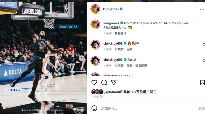 在Instagram動態(tài)中,詹姆斯為多年來支持他的人、以及那些對他惡語相向的人,都留下了這句震撼的話。他還附上了湖人以141-116戰(zhàn)勝老鷹一役的多張賽場照片。塔圖姆在內的多名球員為詹姆斯點贊。