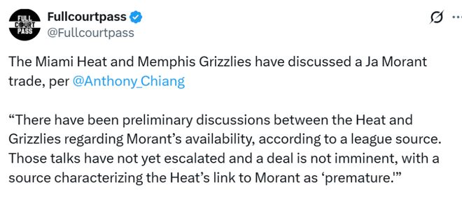 北京時間1月15日,據(jù)熱火隊(duì)記Anthony Chiang報(bào)道,熱火與灰熊之間已就莫蘭特的交易可能性進(jìn)行了初步談判。不過這些談判尚未升級,交易也并非迫在眉睫,有消息人士稱熱火與莫蘭特的關(guān)聯(lián)還“為時過早”。
