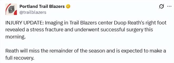 北京時(shí)間1月30日,開拓者官方更新傷情報(bào)告,杜普-里斯的右腳影像檢查顯示存在應(yīng)力性骨折,并已于當(dāng)?shù)貢r(shí)間今日上午成功接受手術(shù)。里斯將缺席本賽季剩余的所有比賽,預(yù)計(jì)可以完全康復(fù)。另外,據(jù)開拓者記者報(bào)道,亨德森和韋斯利已進(jìn)入康復(fù)的最后階段,并且開始參與全隊(duì)對(duì)抗訓(xùn)練。