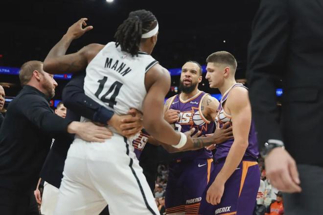 北京時(shí)間1月28日,NBA常規(guī)賽:太陽(yáng)主場(chǎng)106-102險(xiǎn)勝籃網(wǎng)。第四節(jié)還剩1分18秒,雙方爆發(fā)沖突:多人倒地爭(zhēng)搶地板球,籃網(wǎng)新秀杰明將狄龍-布魯克斯推倒。羅伊斯-奧尼爾推了一把杰明,曼恩又上前推奧尼爾,小波特也加入戰(zhàn)斗。