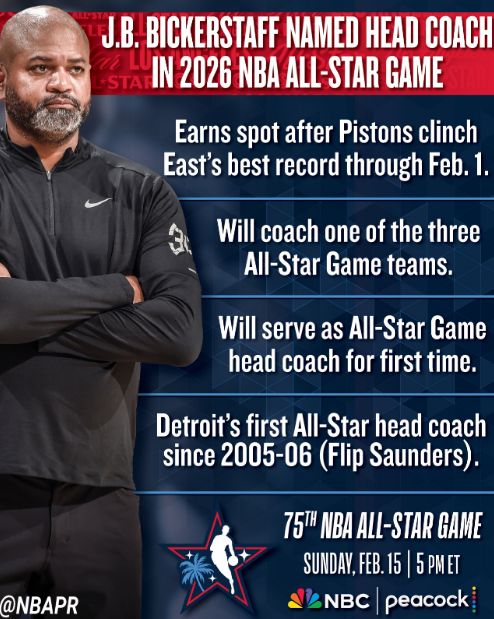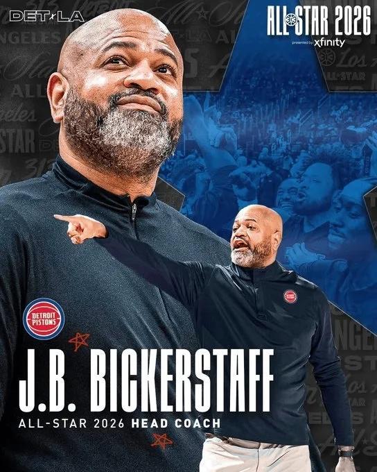 活塞官方曬出海報(bào)祝賀比克斯塔夫,同時(shí)配文寫道:“比克斯塔夫?qū)⒄綋?dān)任26年NBA全明星賽主教練!”