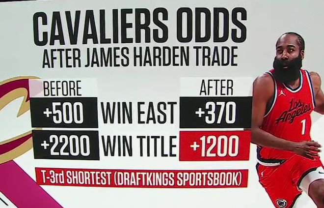數(shù)據(jù)顯示,哈登交易完成前,騎士奪得東部冠軍的賠率是+500(數(shù)字越小,越被看好),奪得總冠軍的賠率是+2200,而哈登交易完成后,騎士奪得東部冠軍的賠率變成+370,奪得總冠軍的賠率是+1200。顯然,哈登的加盟,讓騎士更被看好了。