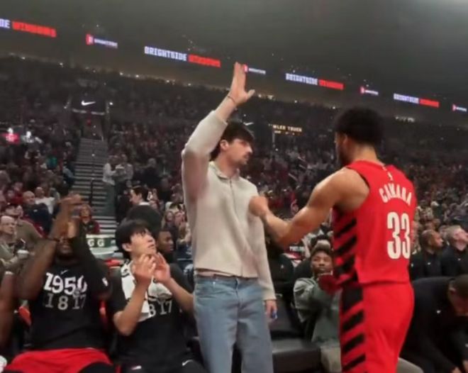 開拓者主場球迷鼓掌祝賀阿夫迪亞首次入選全明星,阿夫迪亞起立致謝,楊瀚森在一旁鼓掌祝賀。