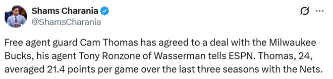 此前,名記Fischer就報道,盡管籃網(wǎng)此前收到過關(guān)于托馬斯的交易報價,但雄鹿是唯一一支真正對他有實質(zhì)興趣的球隊。如今托馬斯成為自由球員,雄鹿簽下也是順理成章。